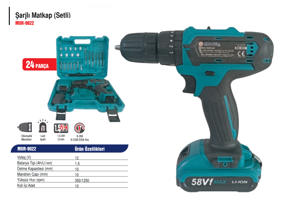 12 Volt Şarjlı Matkap Seti (24 Parça) MUR-9022